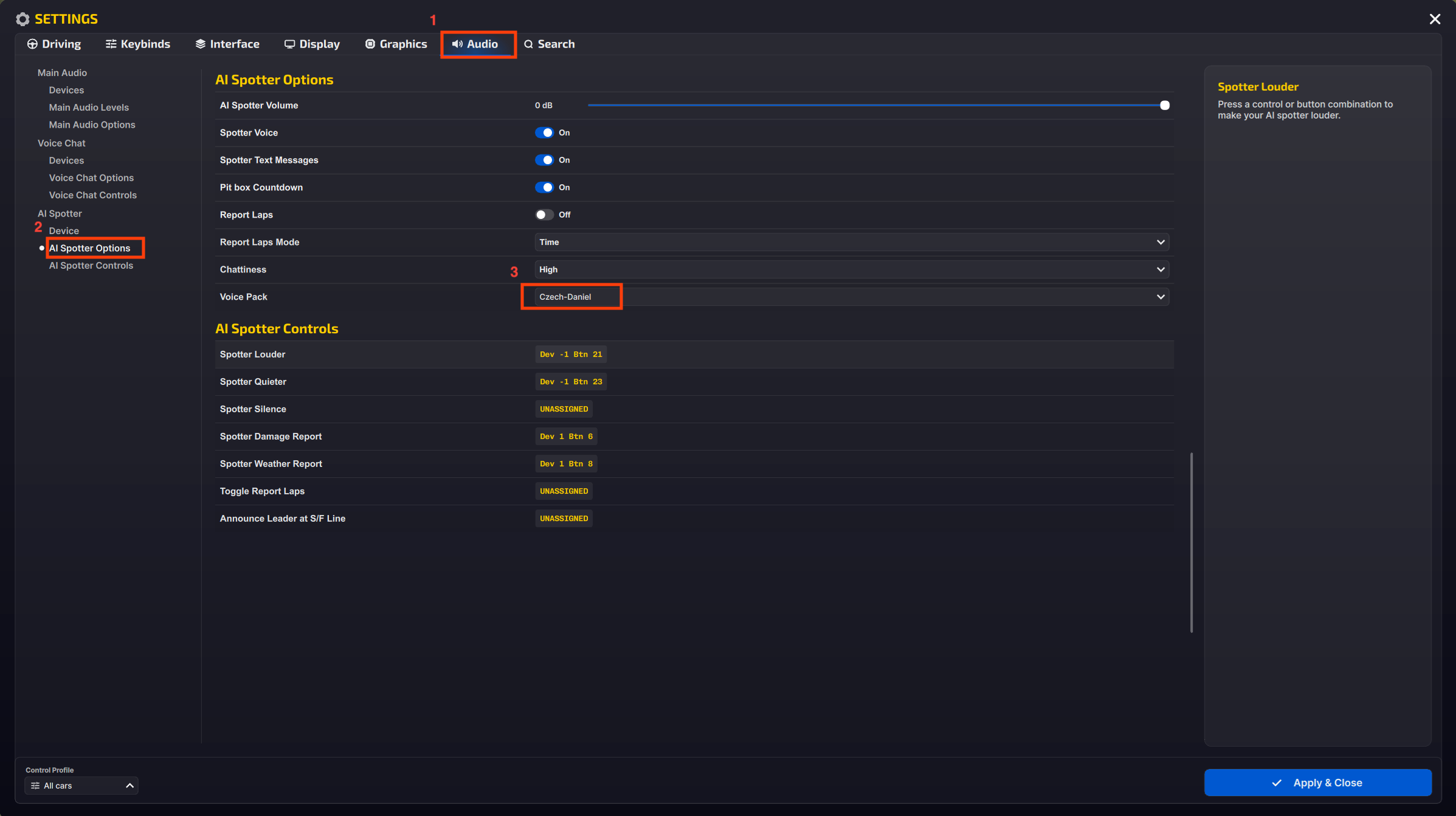 - Po startu závodu v Settings - > Audio vybrat českého Spottera "Czech-Daniel"